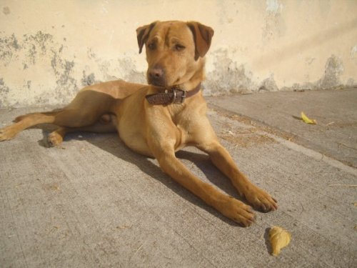 This dog appeared on the streets of my home after the earthquake, is a male brown and is with his collar. He’s scared and hungry. I leave food and there he will eat it; he does not allow any touching yet.
